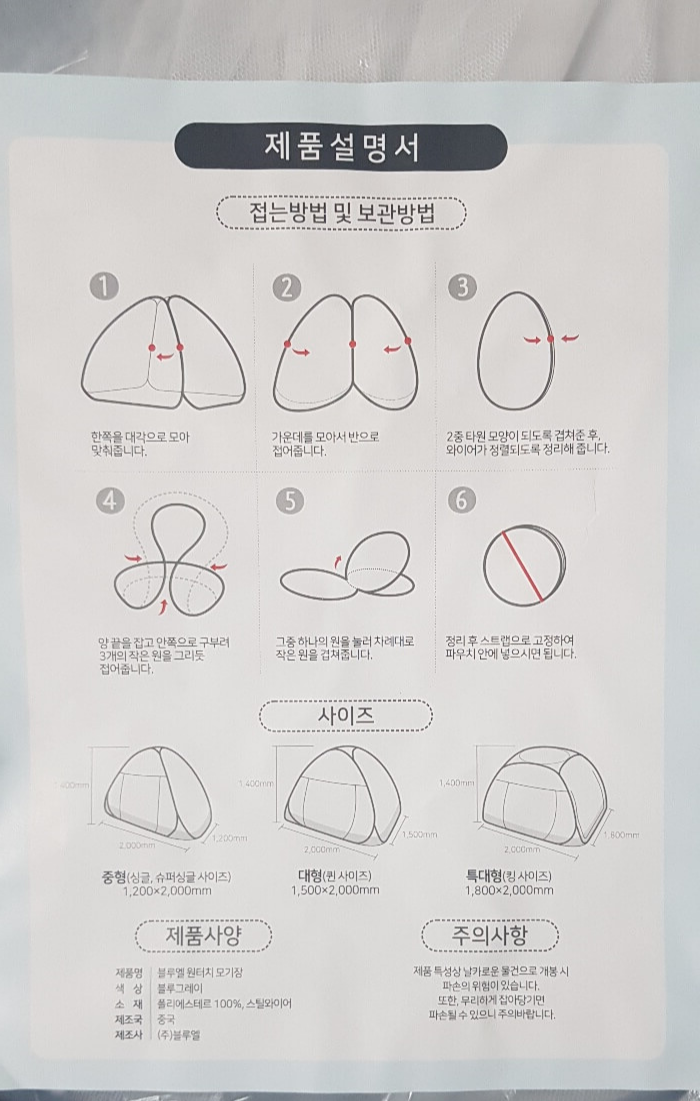 제품설명서인데요. 접는방법 및 보관방법으로 사용한 뒤에는 저 위에 나와있는 설명 순서대로 다시 보관하시면 되겠구요.