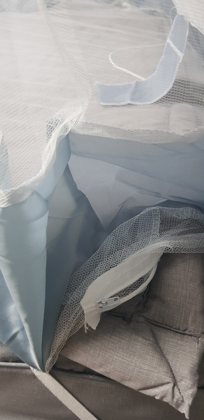 제품 속에 있는 공지사항입니다. 케이블 지퍼에 대한 위치 변경에 대한 내용이었는데, 모기장 텐트 안에서 휴대폰이나 전저기기를 사용하는 경우에 케이블을 안으로 들여야 되는데, 이 케이블을 삽입할 수 있는 지퍼가 바닥면으로 이동했다는 내용이었습니다.