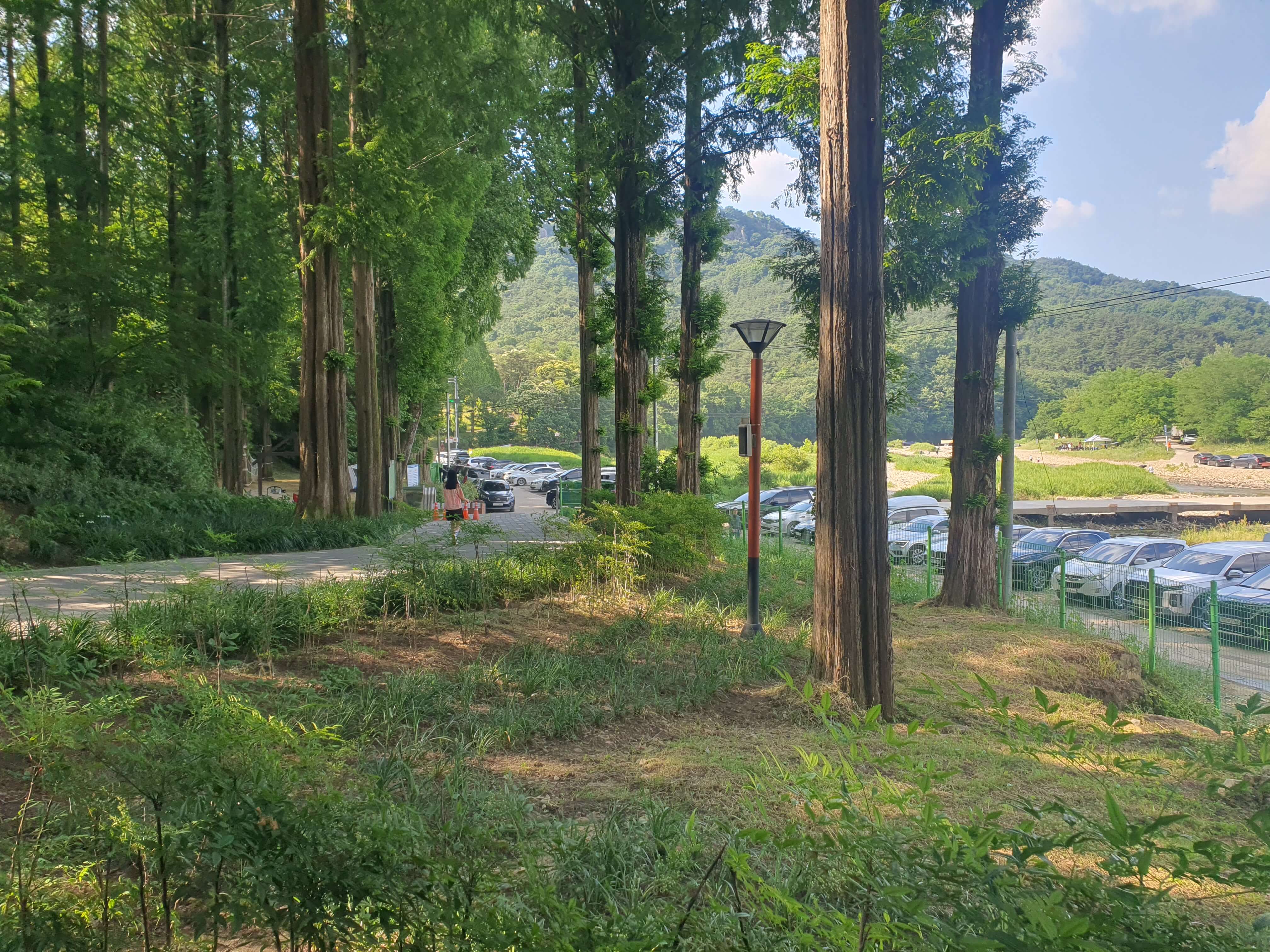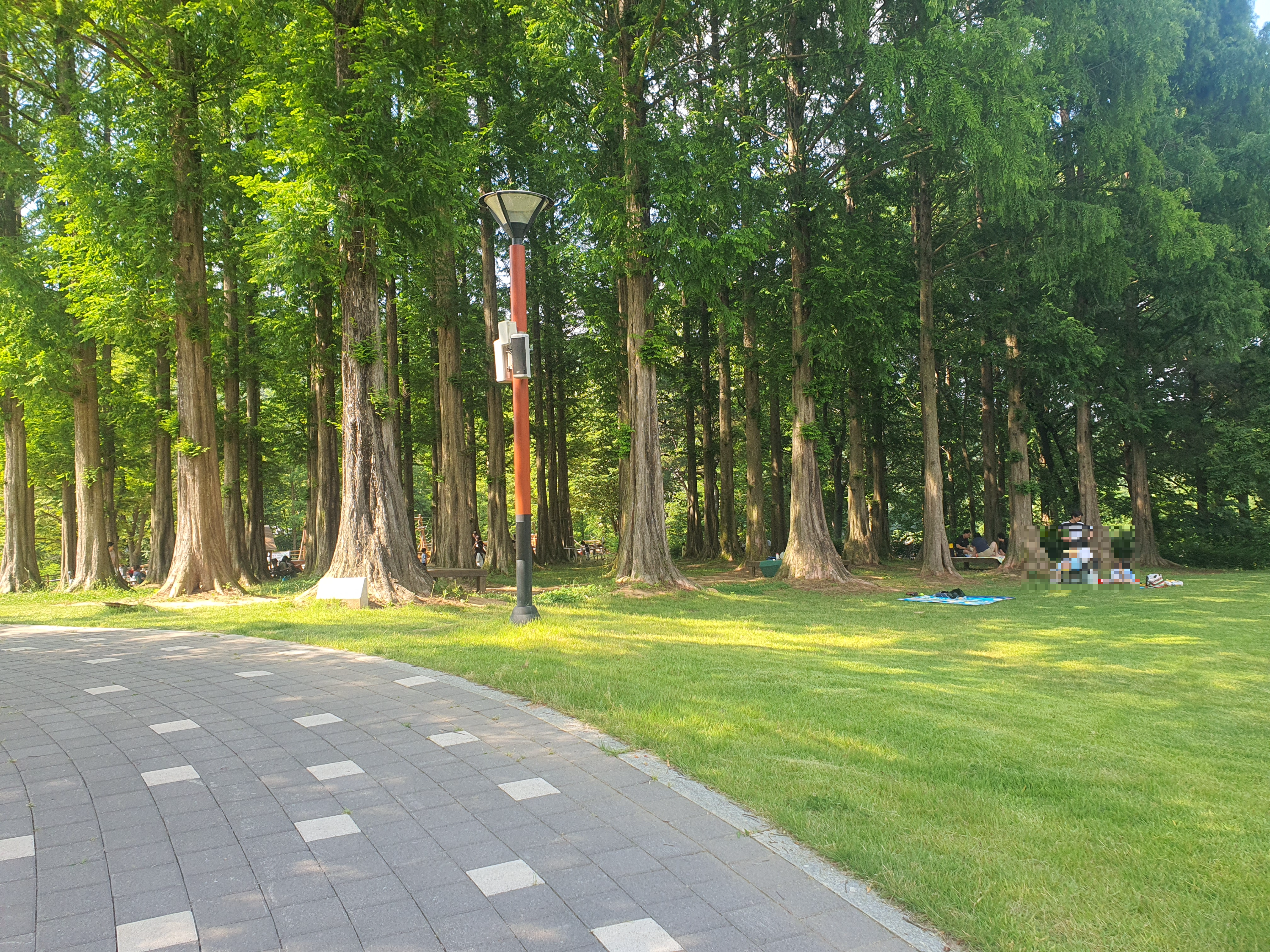 이곳이 노루벌적십자생태원 안에서는 메인 spot인 것 같아요~ 아직까지는 보도블록 길이 잘 되어있고요. 이를 따라가면 이러한 곳이 나옵니다. 이게 무슨 나무죠? 엄청 높고 크고 몸통이 굵습니다. 이 나무만 봐도 뭔가 가슴이 확~ 트이네요. ㅎㅎ 이 큰 나무들이 촘촘한 간격으로 있어서 주위에 그늘을 만들어 주더라고요~ 이곳에 꽤 많은 분들이 자리를 만들어 쉬고 계시더군요~