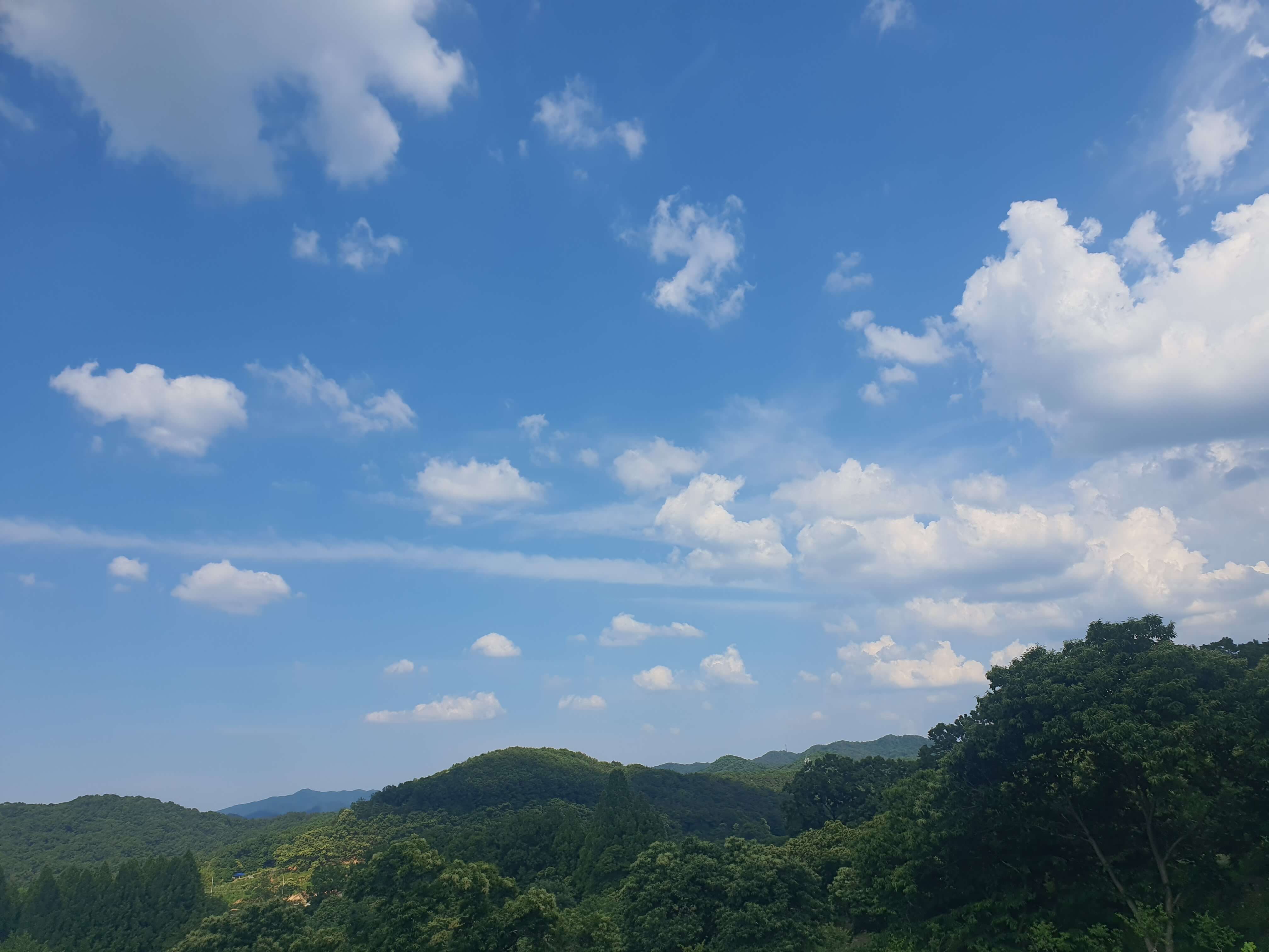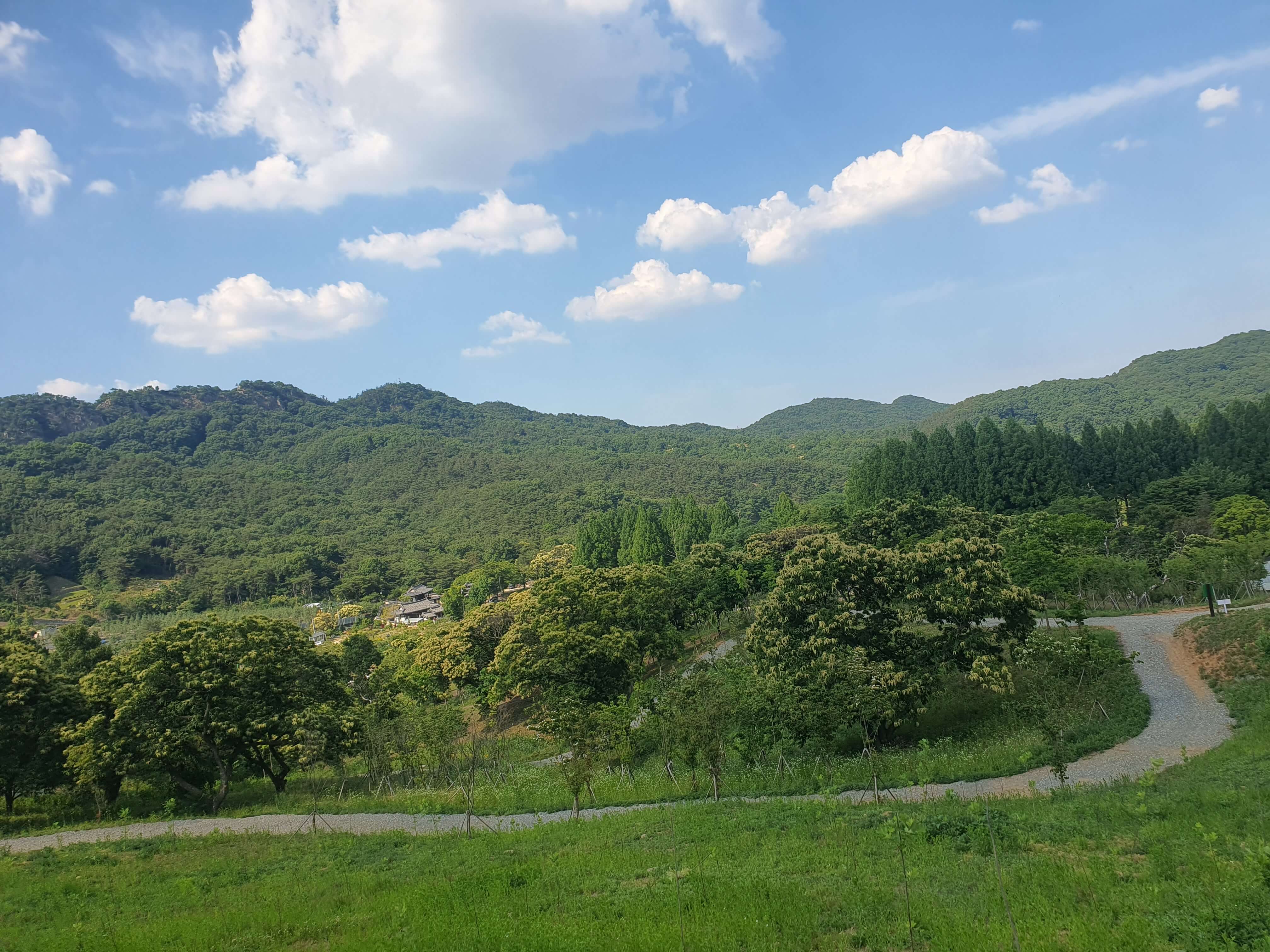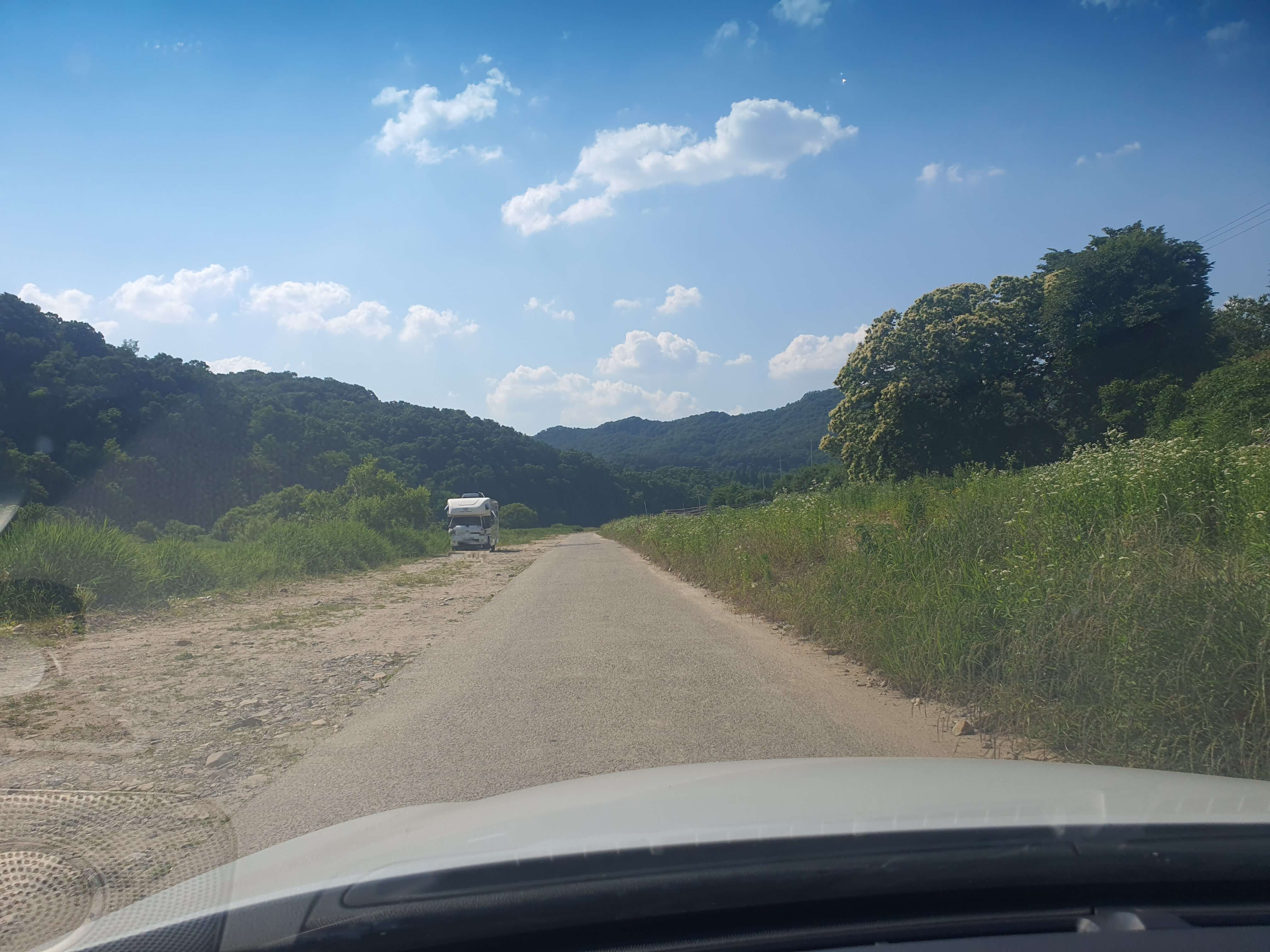 가늘 길목에서 또 저 앞에 보이는 산등성이와 푸르르고 맑은 하늘에 떠다니는 더 구름의 조화가 너무 멋져 한컷을 남기지 않을 수가 없었습니다.