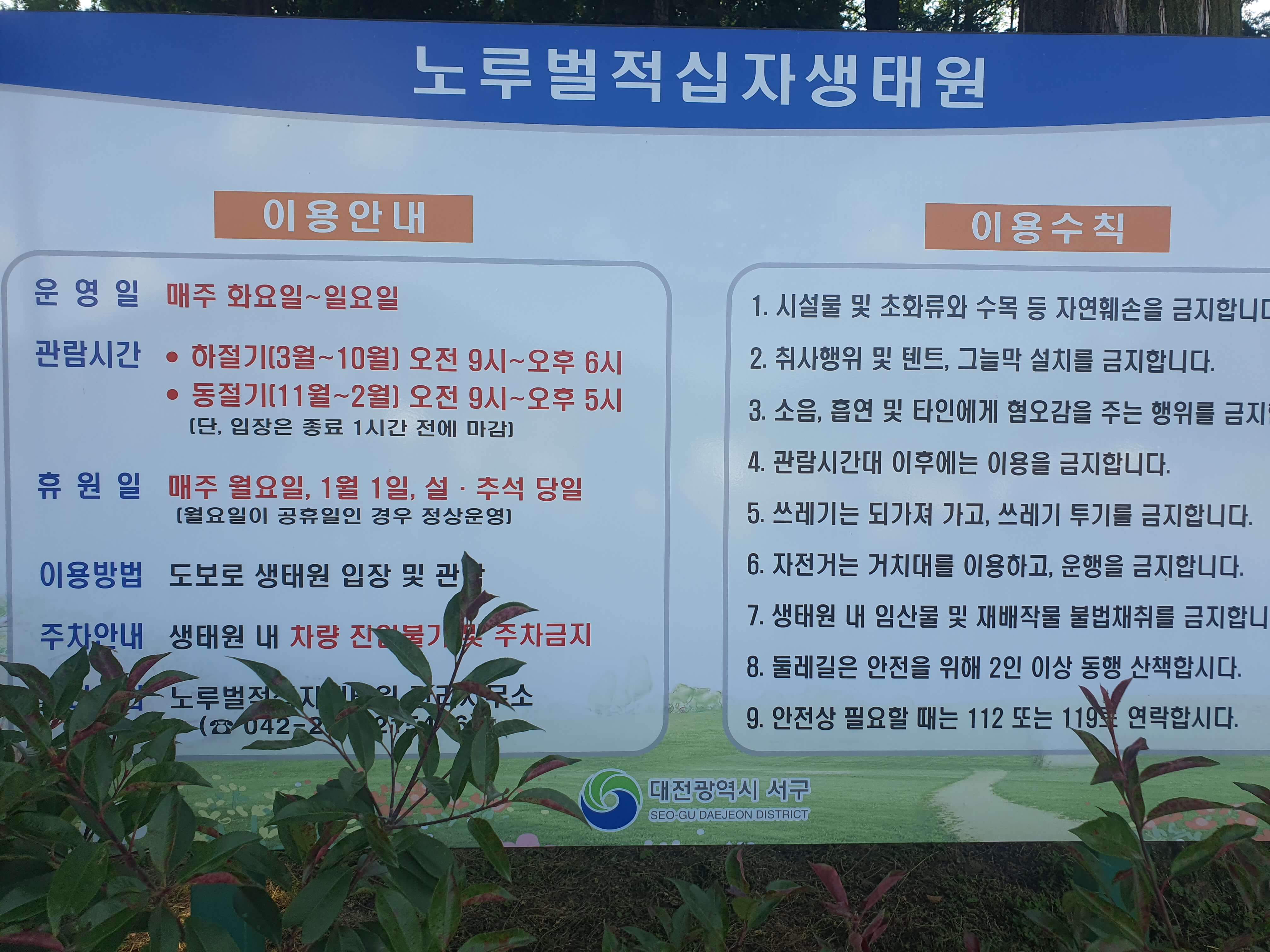 현 위치가 보이며 전체적인 노루벌적십자생태원 지도가 보입니다. 지켜야 할 사항들도 있고요. 대전의 대표 청적 지역으로, 봉긋한 산세가 위에서 내려다보면 아기노루가 엄마노루를 쫓아서 뛰는 형상으로 노루가 노는 벌판이라고 해서 노루벌이라는 명칭이 지어졌다고 하네요~ 구절초와 반딧불이, 미선나무가 노루벌의 상징인 것 같습니다.